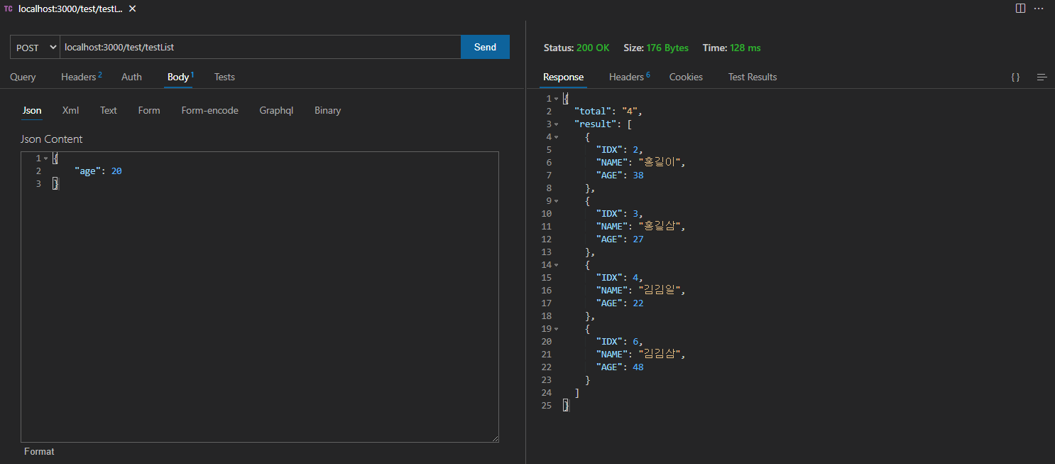 • 이름 또는 나이 조건을 주고 그에 해당되는 데이터를 조회하는 쿼리를 작성한다.